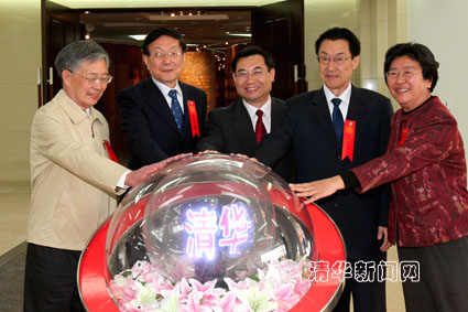 校黨委書記胡和平(中)、校黨委副書記韓景陽(右一)、校黨委原書記方惠堅(jiān)(左一)與國家最高科技獎獲得者、清華校友金怡濂(左二)和王永志(右二)共同啟動開通按鈕