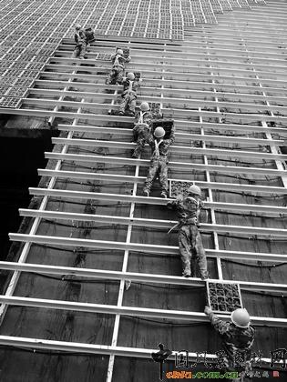 根據(jù)一項(xiàng)墻體綠化與建筑節(jié)能實(shí)測(cè)結(jié)果顯示,有建筑物墻面綠化的建筑,室內(nèi)空氣溫度較無綠化建筑物室內(nèi)溫度低約3℃至5℃,空氣相對(duì)濕度可提高10%~20%。圖為工程人員正在給貴陽市金陽國際會(huì)議展覽中心穿上“綠色外套”。據(jù)介紹,這是一種垂直綠化技術(shù)。首先在方形模塊中種植保水度較高的植物,成活后,將綠色模塊一排排固定在外墻上。這件“綠衣”的背后設(shè)有滴灌系統(tǒng),自動(dòng)為植物提供養(yǎng)護(hù),而略微傾斜墻面也能讓“綠衣”隨時(shí)享受自然雨露的照顧。