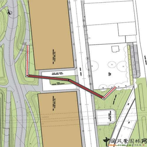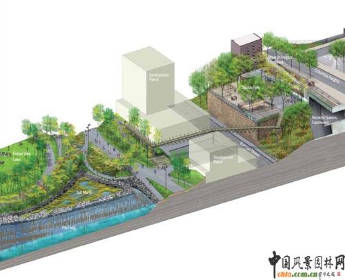 布魯克林高架是從布魯克林高速路走到Squibb公園之前的通道。Squibb公園這個小花園就像一個新的橋梁并連接新的河畔公園。最初的方案提倡直線陡峭步行通道連接兩個街區。但是Zoli看見一個機遇,就是一個隱藏在BQE和Furman街下面廢棄的小塊綠地。設計師提出設計一條蜿蜒的步行小徑,使游客可以更好的接觸自然,探尋自然的秘密。在到達下一個街口Furman街的拐彎處留下足跡,體驗不一樣的步行感覺。拐彎設置向北急轉彎斜坡把途人融入迷人景觀和公園之中。這個特別的轉彎有400英尺長,32英尺高,斜坡坡度為5%。就算是坐輪椅的途人也能夠輕松的上斜坡。
