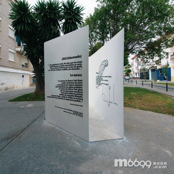 洛爾卡廣場整體由混凝土建造,當然混凝土必須具備最典型的素質,這樣才可在整個城市中運用,比如一種像一層薄膜的過濾混凝土。剛開始項目組采用一種藍色添加劑,但最后由于成本昂貴而放棄。廣場上由玻璃制成的雕塑最后成型的是一張上面刻有些許文字的彎曲的薄板,白板黑字,成為薩各夫雷納的孩子的“迪斯科舞廳”、大學出口的一個隱蔽處、在城市中心的一處安全的所在,就好像田地中的房屋,是第一個孩子們能觸摸得到的地方。