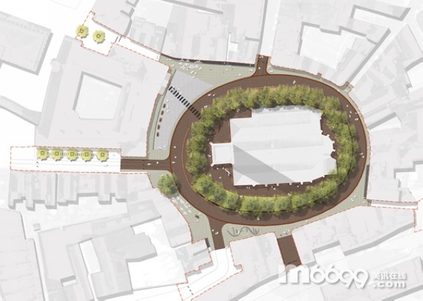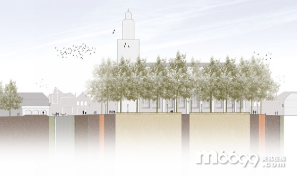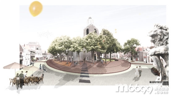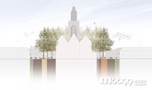 呈橢圓形三維狀分布的樹木是最為突出的空間元素,而現有的設計則將它變成了兩維。由紅磚鋪成的地面形成了整個廣場中性的色調,彰顯著廣場的與眾不同。教堂的周圍有一個巨大的草坪。橢圓的結構并不是一個一成不變的元素,在橢圓結構的一些點上,有眾多元素,它們暗示著通道的位置,最重要的是凸顯Geuzenmonument的位置。為了避免沖突,廣場上的紀念碑使用了本名,這樣就不會和任何的嚴格的設計元素相沖突。
