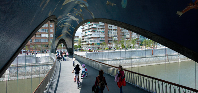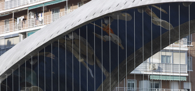 進入大橋其精密的細節設計便展現在我們眼前,橋頂采用西班牙藝術家danielcanogar的馬賽克作品進行裝飾,兩側則以上百條形似鯨魚脊骨的鋼纜貫穿,極富現代感。