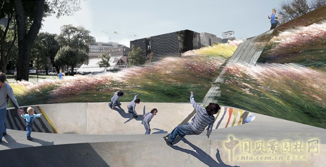 項目計劃種植多種類和大范圍的植物,主要分為兩個部分:急速花園和靜態花園,分別反應花園動靜結合的特色。同時還設置了休息亭,用作冬季取暖和出租滑冰鞋等。光滑的混凝土臺像一塊畫布一樣,給游客展示了街頭高超的輪滑技術。