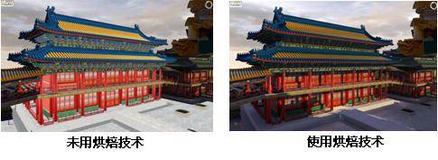 烘焙技術(shù)詮釋更加真實(shí)的光影效果。通過烘焙技術(shù)可以使模型很好的展現(xiàn)體積感,厚重感,與周圍建筑,景觀,植物所產(chǎn)生的光影效果使模型看起來更加真實(shí),美觀。下面有一張“方壺圣境”景區(qū)中對于“瓊?cè)A樓”使用和未使用烘培效果的截圖對比,可一目了然烘焙后效果的提升。