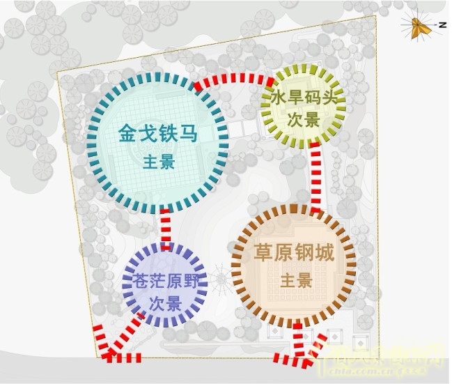 以這四個節(jié)點串聯(lián)起來的觀賞路線亦可反向路線游覽,讓游人切身感受"變遷"這個主題,園區(qū)左右兩側(cè)都設(shè)置了路口,其中以右邊的入口為主。這樣既可以使游人清楚的了解包頭的歷史,也可充分的延長游人的觀賞時間。