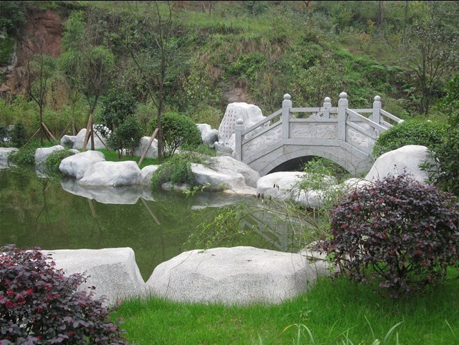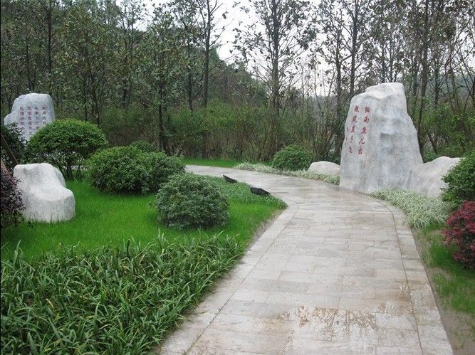 3、長安園入口處于中軸線上,并設置親水平臺,中心設置圓形地景。石質欄桿護岸,桿柱之間有銘壁,鐫刻"長安園"。自然式園路把各景點串接起來,臨水架橋,遇坡修臺,見石繞行,達到自然流暢。在園路兩側布置景石、石刻,高低錯落,疏密有致,自然成趣。