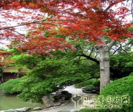 3、彩色葉樹種的配置。種植一些常彩色葉樹種和一些秋彩色葉樹種,使得植物配置富有季相變化。本案所用的參考樹種有銀杏、紅楓、楓香、雞爪槭、紫葉小、紅碧桃、金葉女貞、酒金東瀛珊瑚,八角金盤、紅葉石楠。