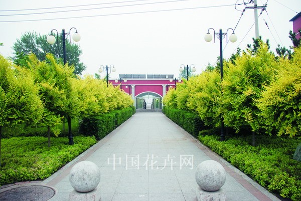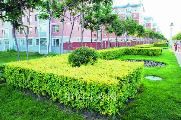 豐富的產品類型創造了多樣的應用形式,即使同一種產品類型,人們在應用時也開發出了很多新的造景模式。尤其是在新優植物品種較少的西北、東北地區,人們充分利用金葉榆靚麗的葉色和極強的適應性,在道路綠化、公園綠地以及城鄉綠化中進行了諸多嘗試。在長春市高速路出口的分車帶上,人們把幾十株金葉榆小喬木成一組密植在一起,冠部統一修剪為方形,十來米種一組,形成了既壯觀又別致的特色景觀,成為人們出入長春的靚麗窗口。在長春市政府前的綠地廣場上,高大的金葉榆喬木和低矮的金葉榆灌叢同時出現,中間穿插其他綠籬進行過渡,頗有氣勢。長春一汽門前的綠地上,不同干高的金葉榆懸空球交相輝映,賞心悅目。