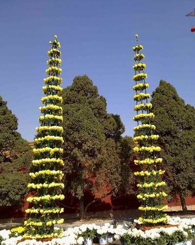 塔菊是將各種不同花型、花色的菊花接在一株3-5米高的黃花蒿上,砧木主枝不截頂,讓其生長,在側枝上分層嫁接。各色花朵同時開花,五彩繽紛,非常壯觀。培養塔菊,在選用接穗品種時,要注意花型、花色、花大小等的協調和花期的相近,以使全株表現和諧一致。