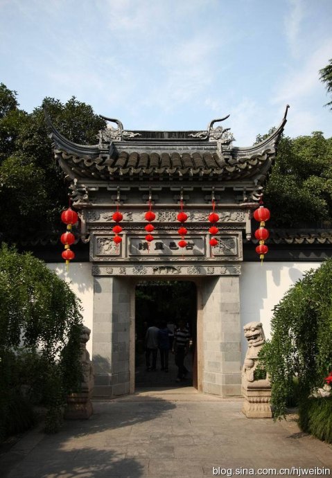 一進曲水園,仰見儀門古典磚雕,儀門正面上鐫“古邑靈跡”,背面雕著“一文園址”。院內梅樹古松,讓人心醉神迷。進內是九曲長廊回環,廓外百花爭艷,宜于閑步神思。