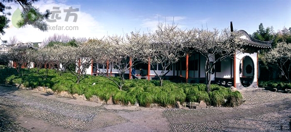 古猗園內(nèi)的道路、樹木、花草之園林要素也十分注重與建筑型制及立意的呼應(yīng)對稱。位于松鶴園景區(qū)中部的梅花廳,五楹,木結(jié)構(gòu),廳內(nèi)墨柱紫窗,前后各有長門16扇,門窗上鑲嵌精雕梅花圖案,老戧飛檐,前后走廊,小瓦結(jié)頂,垂脊平背,嵌花山頭。除廳前兩株古柏,四周滿植紅梅、綠梅、臘梅。鄰近道路也用鵝卵彩石、白磁、青瓦鋪成形態(tài)各異的梅花圖案。仿如梅花開放,暗香浮動,趣味不衰。