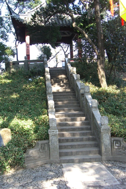 “缺角亭”亭為方形,四根紅漆巨柱,筒瓦攢尖頂,上塑火炬,其東南、西北西南三角塑有緊握的鐵拳,唯東北角無拳。亭內(nèi)上方塑有九龍,四周有花色欄桿及坐凳。線條流暢,氣韻生動。整個構(gòu)筑款式玲瓏,高狀華麗,反映了人民反抗侵略和收復(fù)失地的決心。