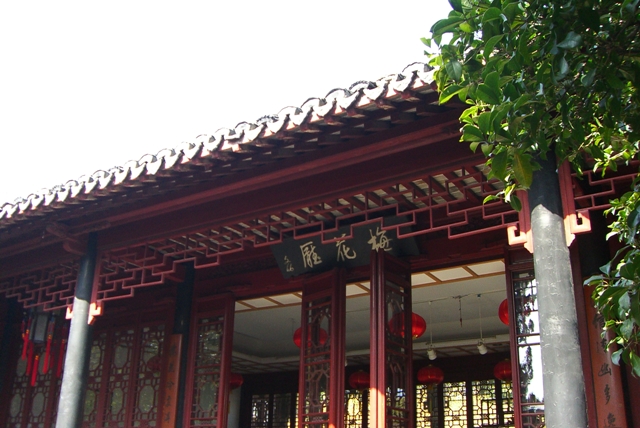 梅花廳全木結(jié)構(gòu),墨柱紫窗,窗格精巧,均由梅花圖案精雕嵌鑲,飛檐古樸,是一座典型的清代宏偉建筑。