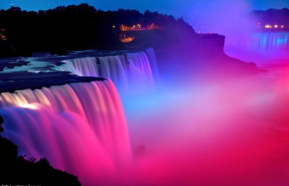 尼亞加拉大瀑布位于加拿大和美國邊境接壤處,在明亮霓虹燈光照射下顯示出尼亞加拉大瀑布的自然美麗。這個階式瀑布猶如夜晚的神秘魔法,瀑布噴霧在燈光照射下呈現明亮的粉紅色、藍色和黃色,與黑暗夜空形成鮮明反差。