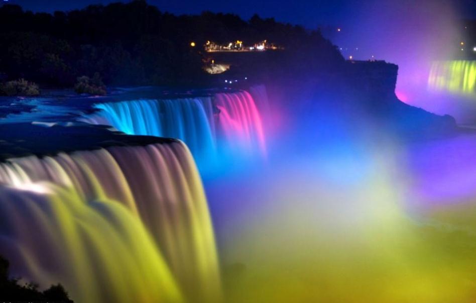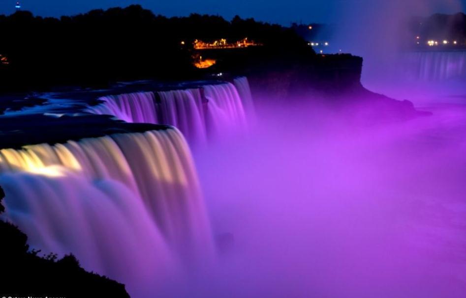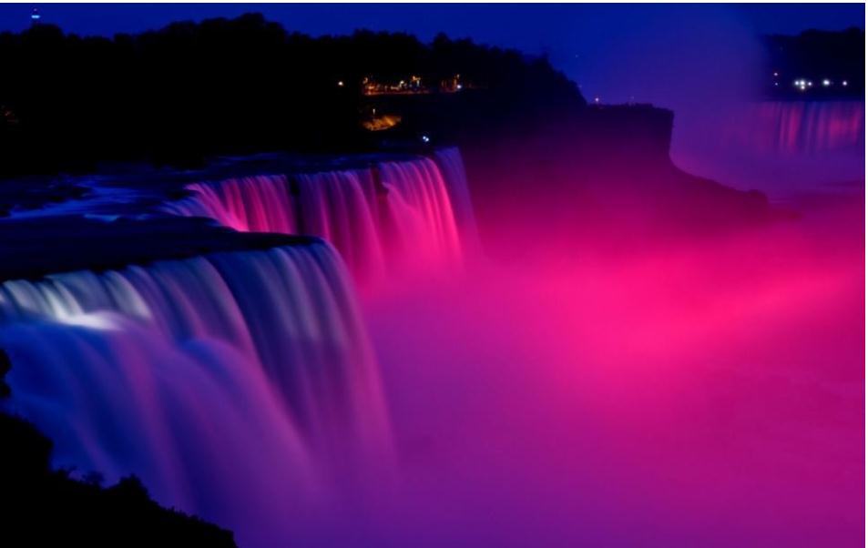 燈光照亮尼亞加拉大瀑布獲得美麗的效果始于1925年,燈光照射下該瀑布可以持續(xù)改變色彩,呈現(xiàn)出令人驚異的視覺效果。最大水流波峰時(shí)每分鐘可達(dá)到168000立方米水流,該瀑布位于加拿大安大略省和美國紐約市交界處。