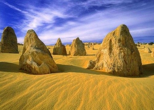 尖峰石陣位于西澳大利亞柏斯北面260公里,乃南邦國家公園的一部份。這個在沙漠的奇異活化石原始森林,有數以千計可高達5公尺的石灰巖柱,確實蔚為奇觀。公園內的奇形怪狀的石柱遍布在沙漠中形成獨特的壯觀。在平坦的沙丘中,四處矗立著石灰巖尖塔式的石筍,最高的有4米,小的只有手指頭那樣大,猶如古戰場的布陣,被譽為“尖峰石陣”。