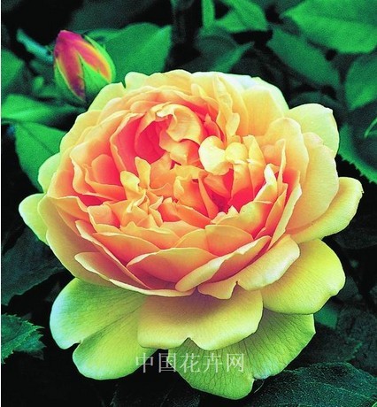黃金月季:金黃色花瓣重疊成杯狀花,墨綠的葉片,濃郁的芳香,是深受歡迎的奧斯汀月季品種。