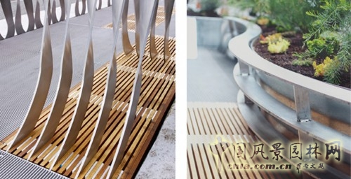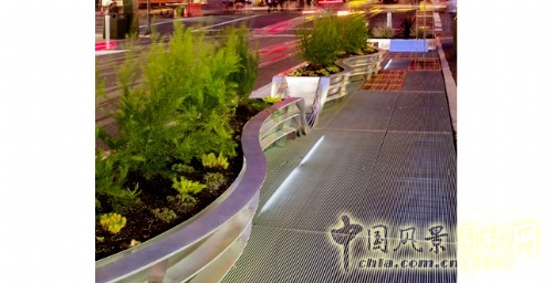 散步廣場的表面是具防滑作用的鋁柵格,中間穿插木質(zhì)材料做裝飾。同時上面的座椅、桌子、欄桿以及12英尺高的燈柱都是鋁材質(zhì)的。燈柱頂上的太陽能板白天吸收太陽能,可供連接的LED燈晚上發(fā)光,制造出繁華夜市里的祥和氛圍。散步廣場的外圍栽植了一些低水需的植物,為游蕩其間的人們提供樂趣。