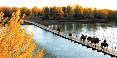 新疆布爾津縣的五彩灘,駝隊跨過額爾齊斯河