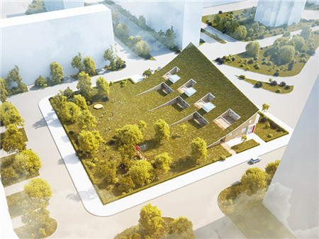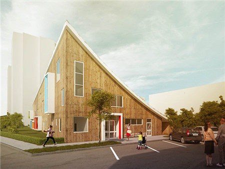Rastvor Group事務(wù)所設(shè)想了一個“山形幼兒園”,整個建筑的屋頂和地面的綠色空間合為一體,傾斜的屋頂結(jié)構(gòu)是這座建筑最大的特色,它是屋頂和地面的界限變的模糊,傾斜的屋頂陽臺可以為幼兒園的教室?guī)砀嗟年柟狻?