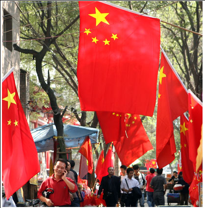 國慶臨近,古城節日氣氛日漸濃厚,五星紅旗飄滿正學街。記者張波攝