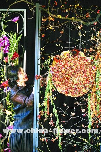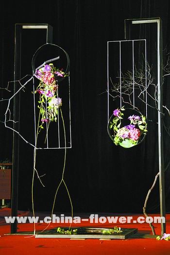 柔婉女子 大氣依舊 第一次接觸韓國(guó)知名花藝師金英珠,是在去年第七屆花之韻上海國(guó)際插花藝術(shù)展上,一場(chǎng)大氣淋漓的花藝表演,讓在座的觀眾不敢相信出自一位柔弱的東方女性之手。在本次花藝表演會(huì)上,金英珠延續(xù)了其一貫的大氣風(fēng)格,依然注重所有舞臺(tái)作品的組合連貫效果。作品完成后,既相互獨(dú)立,又有所聯(lián)系,成為一件組合“大作”。 金英珠的這場(chǎng)表演以中國(guó)傳統(tǒng)“方”、“圓”理念為詮釋核心,將其善用的大型金屬架構(gòu)再次搬上舞臺(tái)。主作品由三件作品組合而成,舞臺(tái)正中的作品用枯樹(shù)枝打底,樹(shù)枝被綁扎成放射狀懸掛于鐵架之上,上面附有各色花朵,顯得秋色斑斕。圓形內(nèi)里用五色雞冠花裝飾,形成半月形;向上延展的荷葉與向下垂吊的稻穗相互呼應(yīng)。圓形作品兩側(cè)是兩個(gè)長(zhǎng)方形鐵架架構(gòu),其中包含著多個(gè)大大小小的圓形,十幾支各色繡球隨意懸垂其上,繡球修長(zhǎng)挺擴(kuò)的感覺(jué),輔助以一些藤類(lèi)纏繞,呈現(xiàn)出一種深秋從容之美(如圖2)。 金英珠的作品以境界見(jiàn)長(zhǎng),其創(chuàng)意雖未見(jiàn)大的突破,但此次表演的作品,更加工于格調(diào)。其后一件作品中,對(duì)稱(chēng)的兩個(gè)鐵藝架構(gòu),互為反正、相對(duì)而立,呈現(xiàn)出繁體漢字“門(mén)”的造型。其中寥寥兩根樹(shù)枝,便營(yíng)造出庭院深沉之境界(如圖3)。整場(chǎng)作品中唯一一件用粘貼手法創(chuàng)作的架構(gòu),滿滿的紅豆黏在一個(gè)圓盤(pán)上,兩邊掛以沉甸甸的麥穗,懸掛在U型鐵架上,周?chē)椴技t豆枝,秋色原野爛漫之美即刻呈現(xiàn)眼前,令人叫絕(如圖1)。