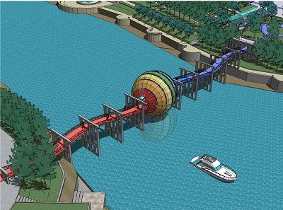 效果圖:橋當中的地球狀標志物正好位于河道中心線位置,球體由南往北按暖冷色調過渡,橋面也由此分為紅藍兩色,寓意地球上的南北氣候特征。(來源:中國網)