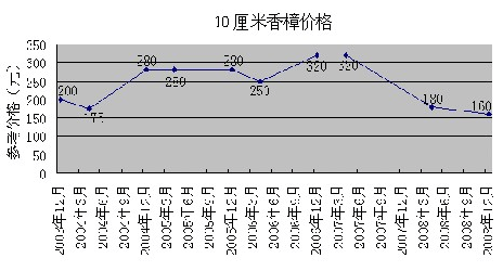 從花木周期波動表中可以看出,從2003年開始,同種樹苗小規格苗木普遍下降曲線較為陡峭,波動幅度較大,大規格花木波動幅度最小。以香樟為例,胸徑10厘米的香樟2004年全年價格為280元,至2006年下半年12月開始沖高至320元,隨后2007年下半年回落至190元,并繼續呈下降趨勢,至2008年12月下降至160元;4厘米的香樟2004年就從上半年的25元下降至15元左右,之后盤整至2006年12月以5元價格探底,然后開始慢慢筑底反彈,并有上升趨勢。通過觀察發現,曾經創造輝煌的木蘭科小苗已有反彈跡象。