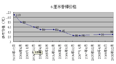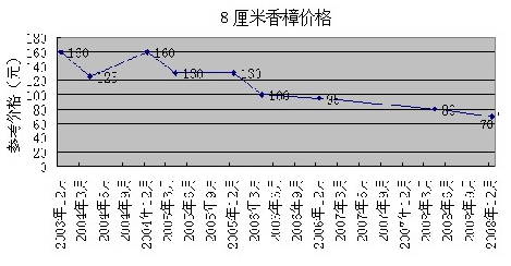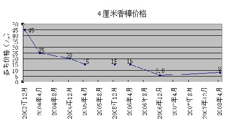 花木價格順大勢而波動,生產亦應順勢而為。按照走勢生產,可以減少出錯。以下是4種規格的香樟從2003年12月到2008年4月的價格波動圖表,可為業內朋友分析花木價格走勢作參考。如果業內朋友對此感興趣,筆者還可提供廣玉蘭、櫻花、銀杏、紅楓、樂昌含笑、杜英、茶花、桂花等多種花木的價格波動圖表,并希望能與業內朋友共同探討。