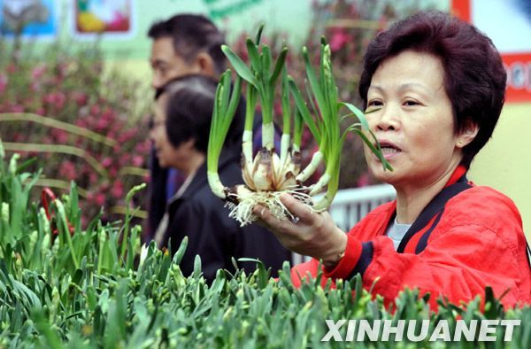2月8日,一名市民在選購水仙。當日,香港維多利亞公園年宵市場啟動,各攤販推出鮮花、禮品、玩具等,吸引市民購買。新華社記者盧炳輝攝