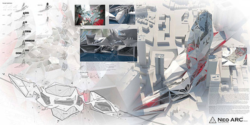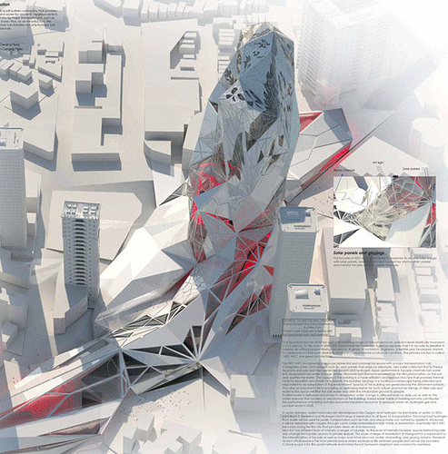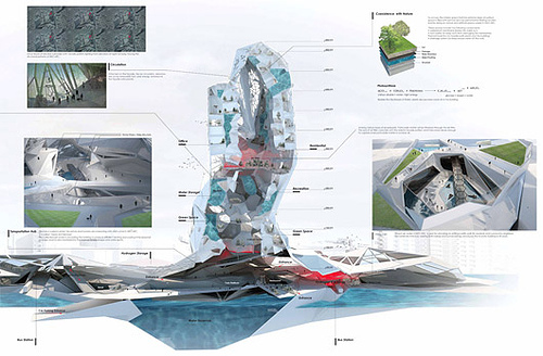 基于各種理論,摩天樓崇拜是地球人的本能,世界各地的城市表達自身能量值的主要方式就是蓋高樓。拿我們國家來說,當前已有高層建筑10萬幢,其中100米以上的超高層建筑1154幢(出處)。國內各地爭建第一高樓,國際高樓排行榜亦常換常新。最近位于紐約的國際建筑論壇 eVolo 舉辦了全球摩天樓設計大賽,出發點是探索摩天樓的發展趨勢。既然是純實驗性的比賽,對場地、建筑高度、外形和技術指標沒有任何規定,參賽建筑師有無限的想象空間,所以結果可想而知。 在大師柯布西耶曾經構想的“光明城市”模型里,大城市的基本要素是高層建筑、快速交通和大片綠地;而本次 eVolo 09 大賽則深入探索了在有限的城市空間里垂直發展的各種可能,從這個角度看它的意義非常重大。看到以下的獲獎作品你或許難以接受覺得匪夷所思,但沒準未來的城市真有可能是這樣的。 第一名:美國 Kyu Ho Chun/Kenta Fukunishi/Jae Young Lee ![]() ![]() ![]()