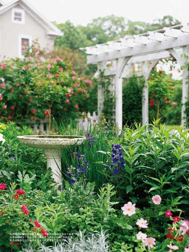 選擇主題 花園無論大小,確定一個風格主題是設計花園和選擇植物的前提。在這個花園定位為清新 浪漫的田園風格,無論你走在何處,總能被柔和清新的色彩和豐富的質感包圍著。白色花朵的植物和構筑物提亮了整個花園的色彩。 分隔空間 通過劃分花園區域,能讓花園變得更舒適實用。這個花園中有種植觀賞區域和供人放松的休憩區,不同的主題讓人行走在花園中注意力不斷被新的景觀元素吸引,產生移步換景的感覺,好像花園也變得更大了,收獲到更加愉快的花園體驗。 增加結構 涼亭、藤架、籬笆和花門等構筑物在花園中起著十分重要的作用,這些結構性的設計能增加花園中的視覺焦點,讓花園即使在冬季植物枯萎后,也能保持很好的結構形態。這里,白色的藤架和籬笆等構筑物不僅為花園帶來立體的視覺效果,也起到提亮花園色彩的作用。藤架為攀援月季等植物帶來提供了向上攀爬的空間。 攀援植物、多年生植物。。在樹木的襯托下格外清新悅目,展現出甜美的鄉村風格。堅實的藤架和園門被刷成白色,與建筑色彩相互融合,看起來十分協調。 以玫瑰為代表的粉色系植物簇擁在石板路兩邊,下面種植了貓薄荷,將人引入充滿魅力的的休閑區內。 薔薇Rose‘Carefree Wonder’下面種植了貓薄荷,左側是玫瑰rosa rugosa‘Fru Dagmar Hastrup’,下面種植了白色和粉色的一年生植物annuals。 一旦坐在帶有舒適座墊的鐵藝椅子上,完全置身與茂盛的花草之中,令人倍感放松。 薔薇‘Carefree Wonder’為花園增添了浪漫氣息。 鐵線蓮‘Will Goodwin’ 攀援在白色的籬笆墻上,它的花朵直徑有15厘米長,能持續整個夏天。 花園里的棚架不僅豐富了庭院層次,也為攀援植物提供了生長空間。這株玫瑰紅色的‘John Cabot’薔薇下面種植了白牡丹和美女櫻,色彩的對比為花園增加了清新柔美的感覺。 延續整個花園中的鄉村主題,一個白色的鳥浴盆為這個多年生種植園增加了視覺亮點。藍紫色飛燕草、玫瑰紅色的月季、粉色波斯菊和白色牡丹花由淺入深的豐富了庭院色彩。 挺拔的毛地黃給種植園增加了高度的變化。 以薔薇為主體的花園不僅美觀,也十分容易維護,這種花具有頑強的生命力。降低了花園的維護成本。 TIP專家解讀 了解英式田園風格 英國的風景式庭園采用的是典型自然式布局,模仿純天然景觀的野趣美,以自然式地形、水體、園路和植物組織庭園,體現出濃郁的自然情趣。 如何規劃布局 英式庭院向往自然,崇尚自然,因此它采用開放式的空間結構,大面積的自然生長花草是典型特征之一。自然的樹叢和草地,隨處可見的花卉綠植,注重花卉的形、色、味、花期和叢植方式。硬質構造物則采用天然木材或當地的石料,以使之融入周圍環境。 把握硬質景觀特點 以天然石材為主,形成自然美感的園路。園中還多用原木鋪成園路、臺階等。由于英格蘭地區氣候適宜,所以草坪作為主要道路鋪地材料,這充分體現出人與自然的融合。英式庭院構筑物較復雜,常見圓柱、涼亭、觀景樓、方尖塔和裝飾墻等;花架是英國風景式庭園中應用最多的建筑形式,常采用木材、石材、磚或混凝土,也有采用古典柱式植物組合成花架。 巧用裝飾元素 英式庭院中較多建造一些裝飾物,如:雕塑、自然噴泉水景、原木坐凳、日晷、供小鳥戲水的柱盆、花盆、石缽等。 如何搭配植物 植物以自然式種植為主,除了最具代表性的爬藤植物,如玫瑰、薔薇、鐵線蓮外,還應用大量喬木、花灌木、宿根花卉和地被植物,如:白樺、洋槐、黃楊、美人蕉、絲蘭、鼠尾草、熏衣草、萱草及多年生植物。植物都自然生長,不刻意的修剪,重視其色彩的搭配和相稱,突出體現自然植物的群落和特點。 戶外家具搭配 因為英式庭院呈現出的是花朵繁茂,清新自然的效果,庭院中又多用庭院里多用木質構筑物,如涼亭、花門、籬笆等,尤其以白色最具代表性。所以戶外家具最好是用和構筑物相同的材料。比如白色的木質家具搭配花朵圖案的舒適座墊和靠墊。